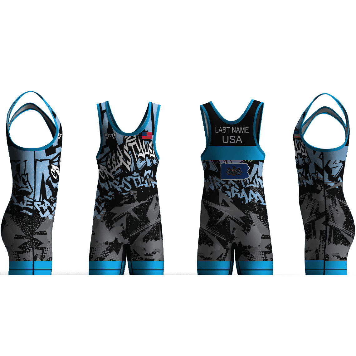 We fully sublimate all of our singlets so that your custom art and logos will look great wash after wash with no cracking, peeling or fading. Our Singlets are made of 7.6 oz. Poly / Lycra /Spandex fabric, for that perfect fit and feel. Top quality flat-lock stitching is used for the strongest and most comfortable seams. We finish off these singlets with soft covered elastic leg bands and internal sublimated sizing for a smooth comfortable feel that won’t come off.