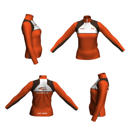 Women’s fit. At 4.5 oz. this is the lightest shirt we make. The micro interlock fabric hangs nicely and fits closer to the body. It has contrasting mesh panels that wrap around the shoulders and under the arms. It comes in men, women and youth sizes. These 1/4 zips have a good amount of 2 way stretch and work nicely with our wrestling shorts for a popular warm up set.