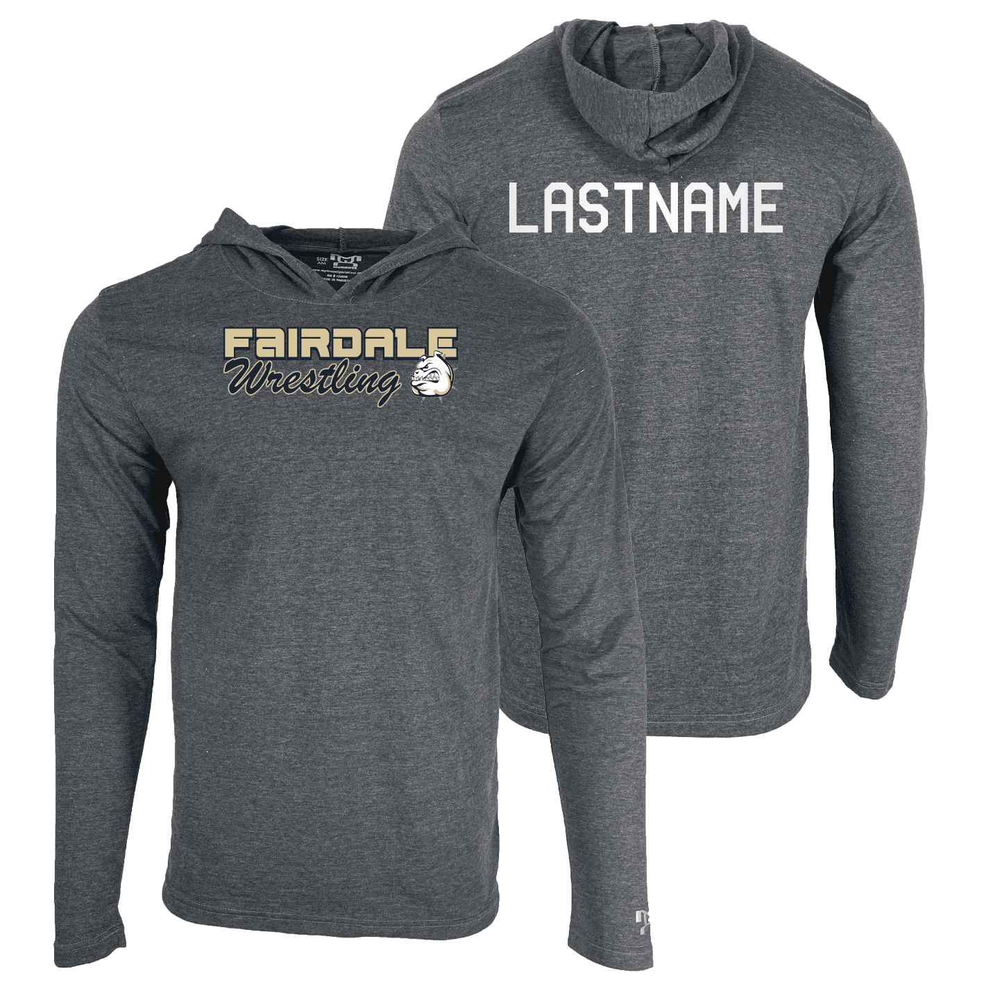 Our hooded long sleeve t-shirt is a heathered dark grey, 4.5 oz. soft combed, 65/35 poly cotton blend, with set in sleeves. Works great on its own or layered, it may include a soft touch poly-plasti front decal.