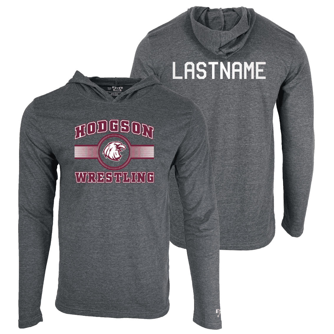 Our hooded long sleeve t-shirt is a heathered dark grey, 4.5 oz. soft combed, 65/35 poly cotton blend, with set in sleeves. Works great on its own or layered, it may include a soft touch poly-plasti front decal.