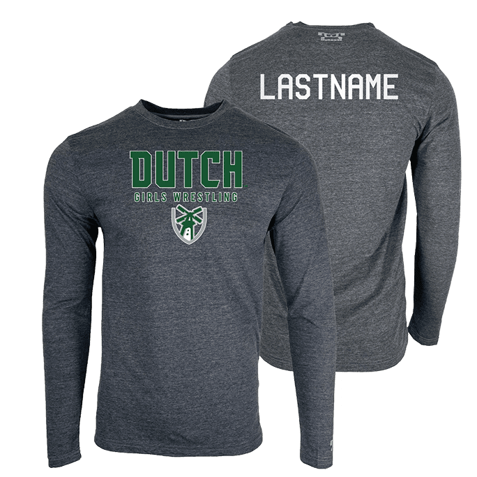 Our hooded long sleeve t-shirt is a heathered dark grey, 4.5 oz. soft combed, 65/35 poly cotton blend, with set in sleeves. Works great on its own or layered, it may include a soft touch poly-plasti front decal.